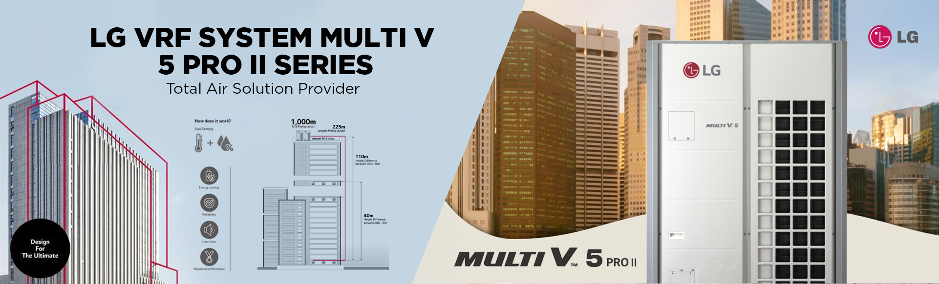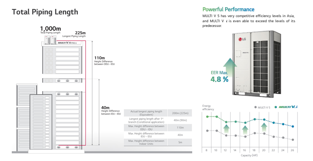 MULTI V i menawarkan kapasitas besar dengan dukungan hingga 26 HP dalam satu unit outdoor dan kombinasi sistem mencapai 76 HP. Fleksibilitas instalasi didukung panjang pipa hingga 1.000 meter, perbedaan ketinggian indoor–outdoor hingga 110 meter, serta jarak antar indoor hingga 40 meter. Sistem ini dapat menghubungkan hingga 64 unit indoor dalam satu jaringan, menjadikannya solusi ideal untuk gedung perkantoran, pusat perbelanjaan, rumah sakit, maupun apartemen bertingkat.
