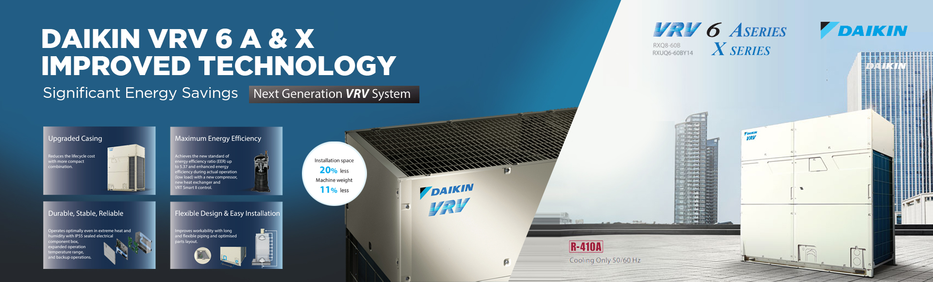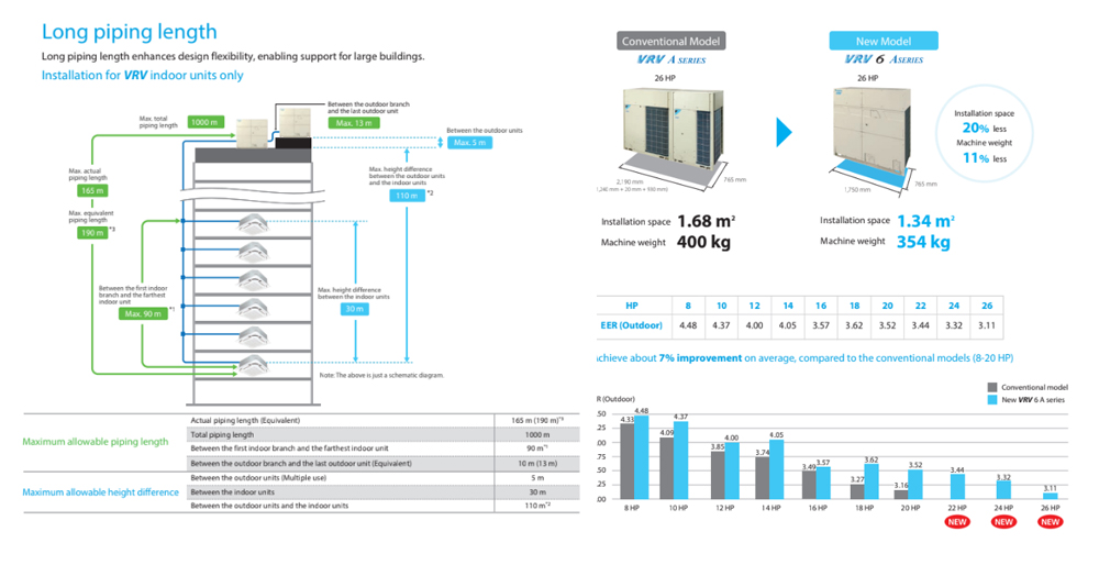 Generasi terbaru ini menawarkan fleksibilitas instalasi yang jauh lebih baik dibanding pendahulunya. Panjang pipa refrigeran dapat mencapai 190 meter, meningkat 20 meter dari model lama. Selain itu, perbedaan ketinggian antara unit indoor dan outdoor dapat mencapai 110 meter. Fleksibilitas ini memungkinkan penerapan VRV 6A pada gedung tinggi, apartemen, perkantoran, maupun hotel dengan kebutuhan instalasi yang kompleks.