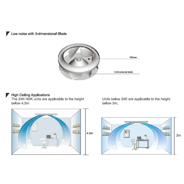 High Ceiling Applications 3 PK ke atas Ideal untuk ruangan dengan ketinggian hingga 4,5 meter. 2 PK Direkomendasikan untuk ruangan dengan ketinggian di bawah 3 meter.