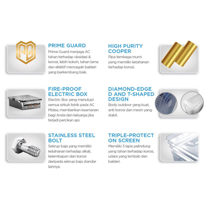 Xtreme Dura adalah 6 komponen penting pelindung AC Indoor & Outdoor Midea, terdiri dari Prime Guard, Fire-Proof Electric Box, Diamond-Edged and T-Shaped Design, Stainless Steel Bolt, High Purity Cooper, Triple-Protection Screen.
