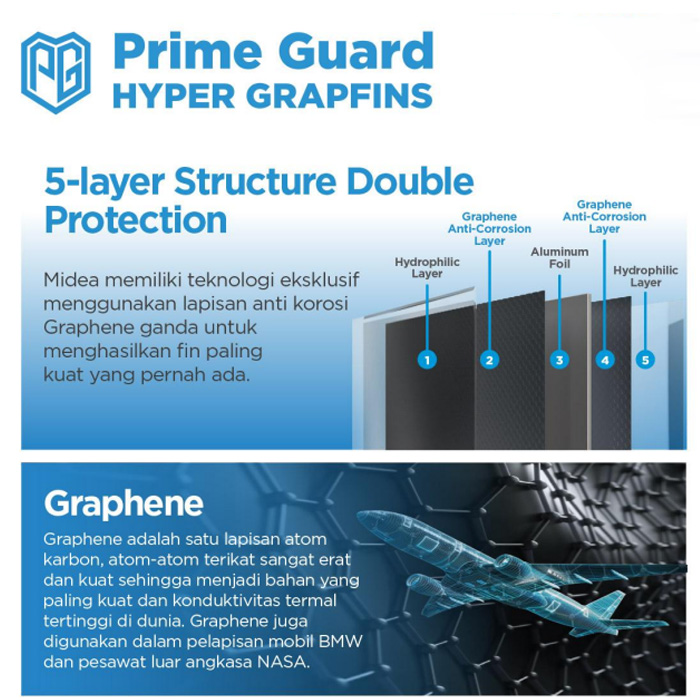 HyperGrapfins adalah lapisan berbahan dasar karbon dengan struktur atom yang terikat erat, menjadikannya material paling kuat dengan konduktivitas termal tertinggi di dunia. Dengan ketahanan korosi 12,5 kali lebih baik, lapisan ini memberikan perlindungan maksimal untuk penggunaan jangka panjang. Diterapkan pada unit outdoor, HyperGrapfins mampu menjaga ketahanan korosi hingga 20–50 tahun, bahkan dalam kondisi ekstrem.