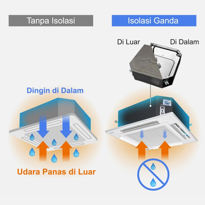 Isolasi Ganda untuk Mencegah Kondensasi AC ini dilengkapi dengan isolasi ganda untuk mencegah kebocoran akibat pengembunan. Bagian dalam unit indoor tetap dingin, dan isolasi berkualitas tinggi pada bagian dalam dan luar unit melindungi dari kondensasi sehingga ruangan tetap kering dan nyaman.